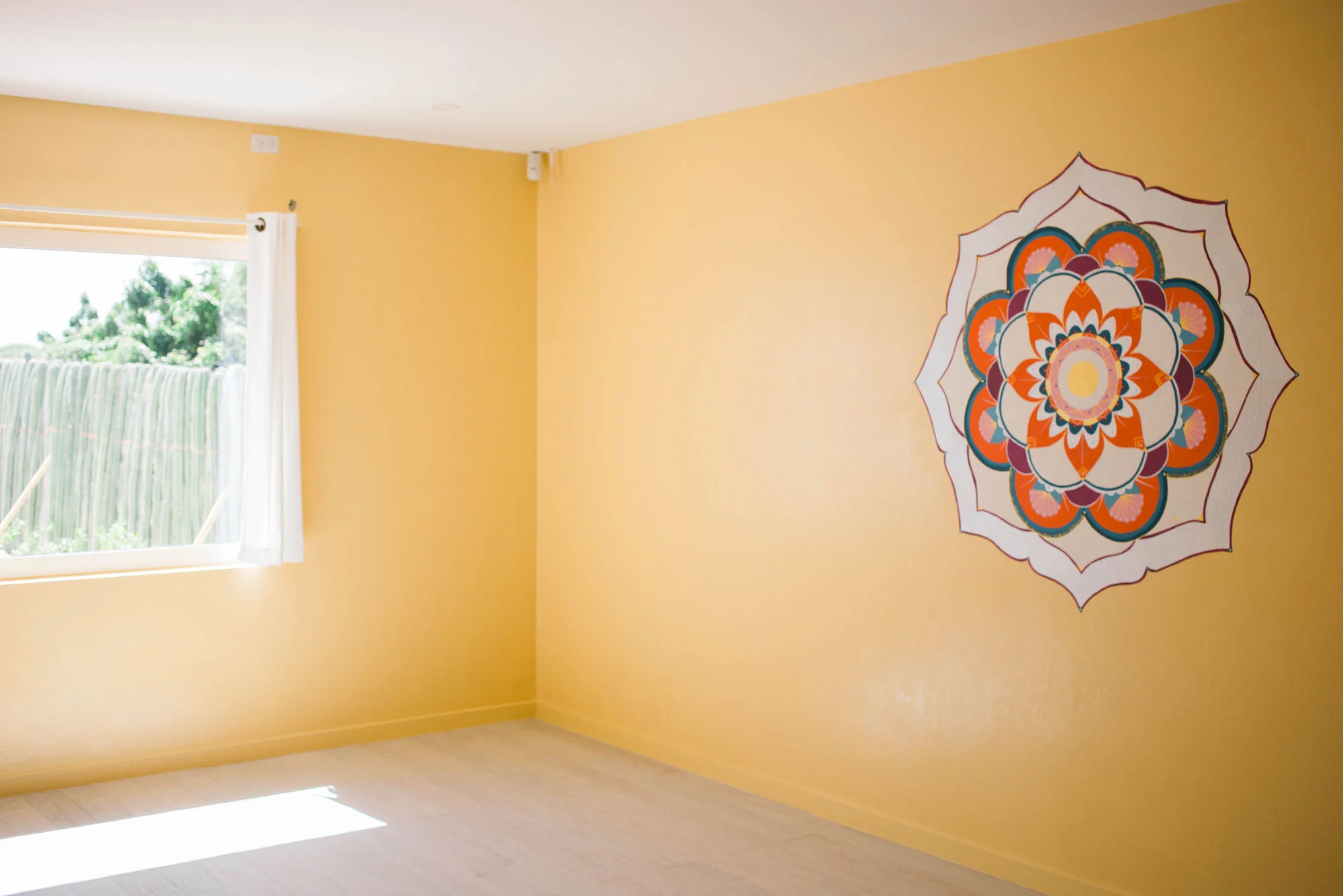 Island Yoga's main yoga shala, the Luna Shala, has a cooler and more lunar color scheme and can hold 60 students in a single class. The altar is adorned with amethysts imported from Uruguay, and holds honey calcite crystals covered with the moon phases (designed by Kelly's sister Luna Robinson) as a nod to Rachel's famous tattoo. The smaller Sol Shala features a hand painted mandala design by Maria Onni. A sustainable white bamboo from Cali Bamboo based out of Los Angeles, was chosen for the floors of both shalas.